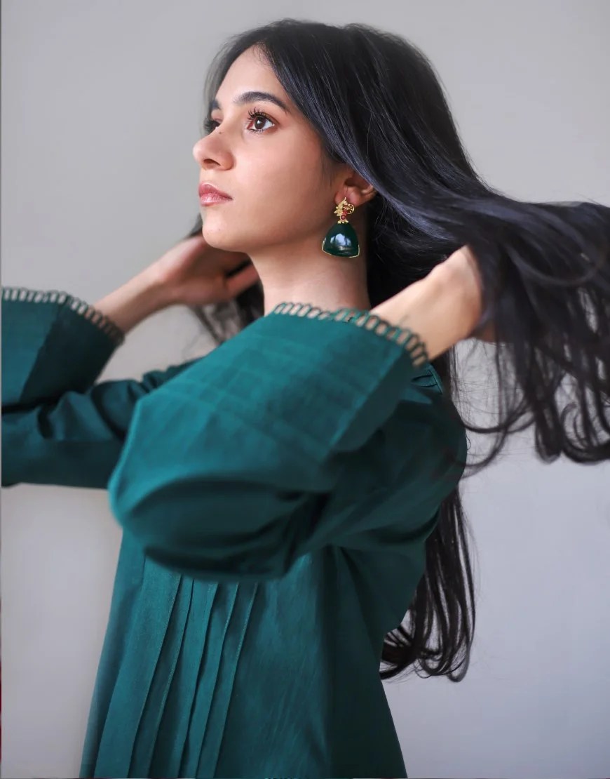 IA luxurious deep green that is perfect to dress up or down. Pair it with your favourite printed dupatta or shawl for an even more elevated look.