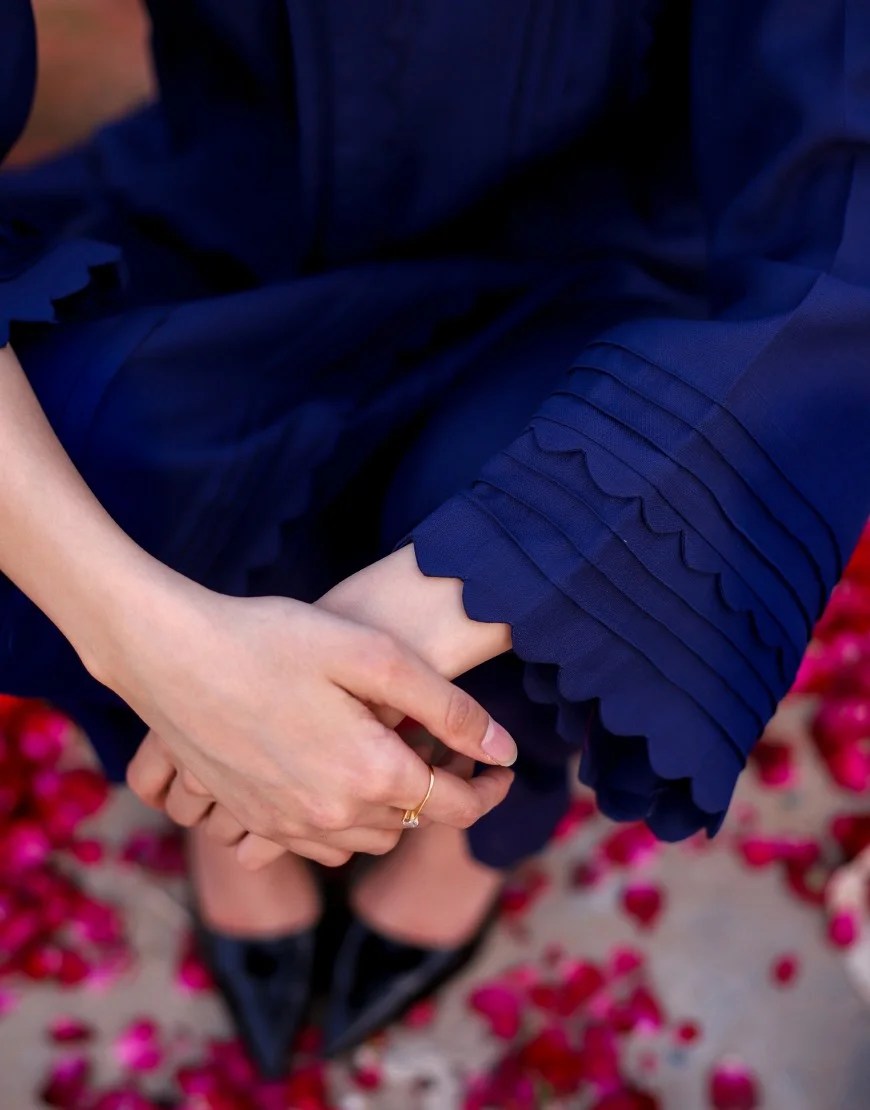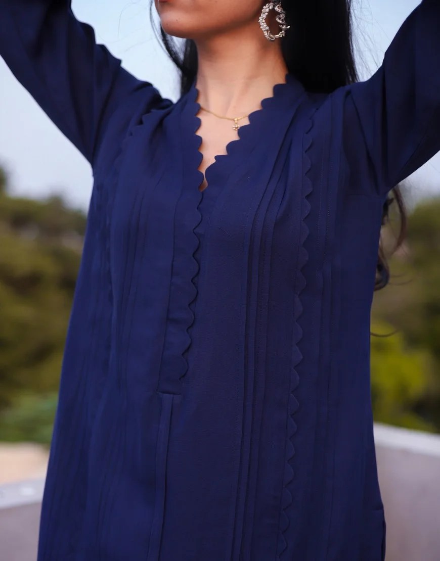 This classic navy blue set is all about the details. Complete with beautiful lace detailing on the sleeves and scalloped finishing.